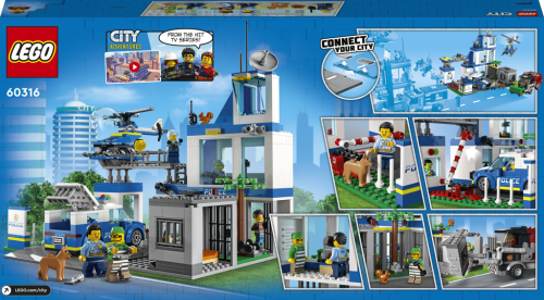 Třípatrový model Policejní stanice (60316) od LEGO® City je doslova nabitý inspirativními detaily, včetně cely s funkcí úniku, dvorem, na kterém se prochází zloděj, a psího cvičiště. Děti se mohou dále těšit na policejní auto, vrtulník a speciální popelářský vůz, ale také na křižovatku umožňující propojení s ostatními sadami. Pak už jen stačí přidat 5 minifigurek, včetně 3 postav ze seriálu LEGO City Dobrodružství, a hraní může začít.