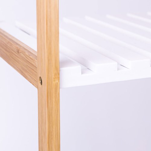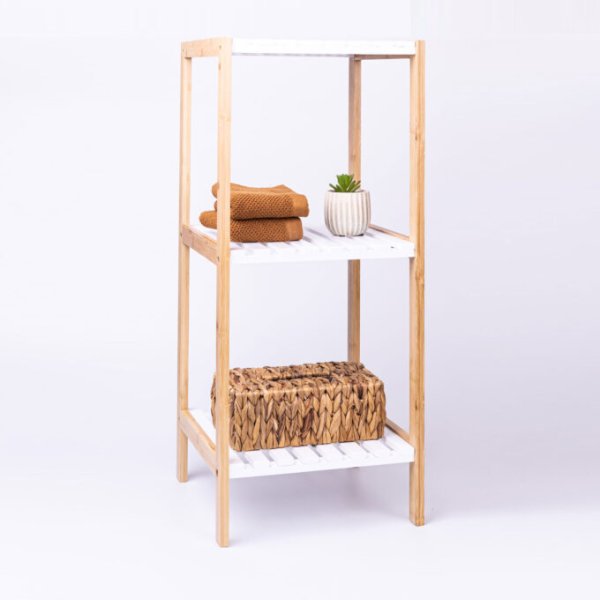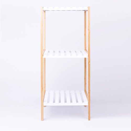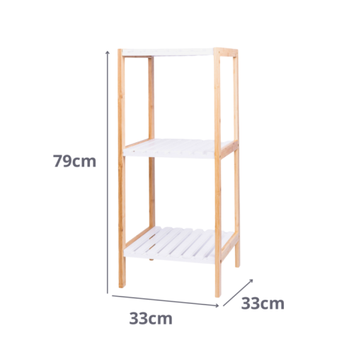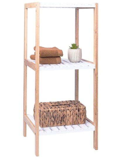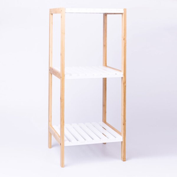 koupelnový regál, 3 police mdf, bambusové nohy s bílými policemi, rozměr 33x34xh79cm, nohy 13x32mm