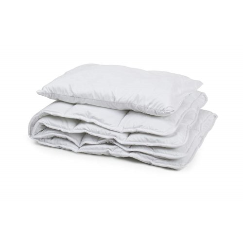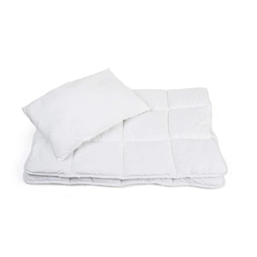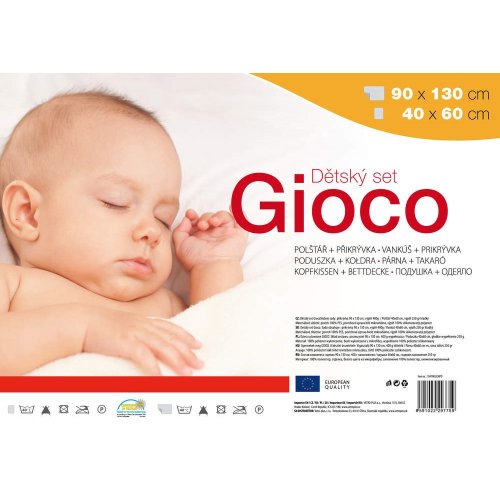Dětský ložní set GIOCO, přikrývka 90 x 130 cm (400 gr.), polštář 40 x 60 cm (250 gr,), svrchní část tvořena bílým mikrovláknem, náplň silikonizovaný polyester. Vyrobeno v EU.