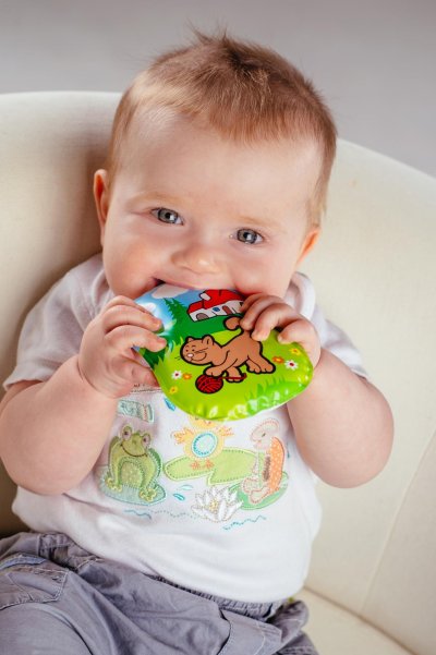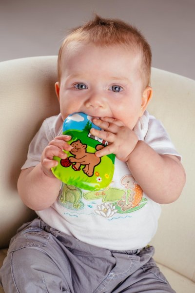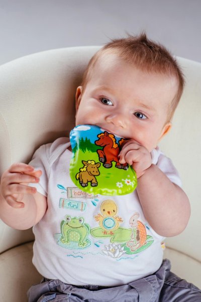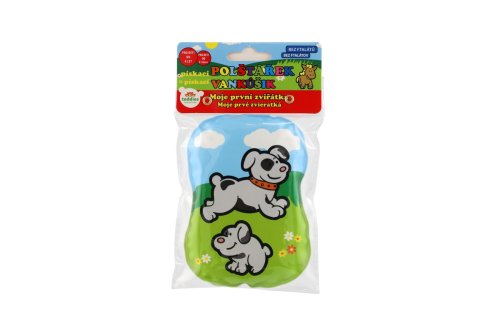 Pískací polštářek pro nejmenší s obrázky zvířátek. Je vhodný pro děti od 0 let, je bez ftalátů a řádně certifikován.