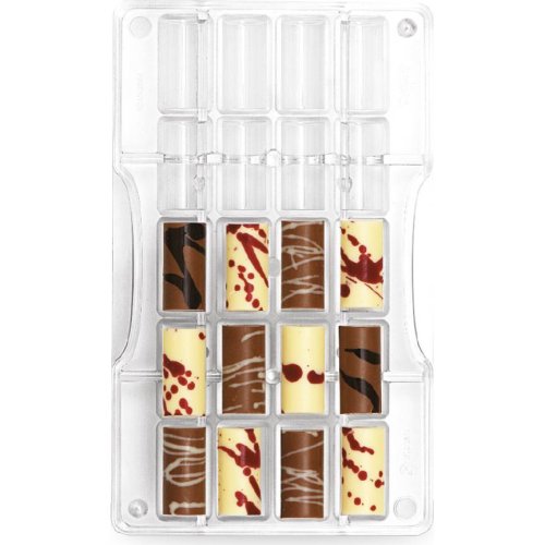 Polykarbonátová forma na výrobu domácích čokoládek ve tvaru válců.