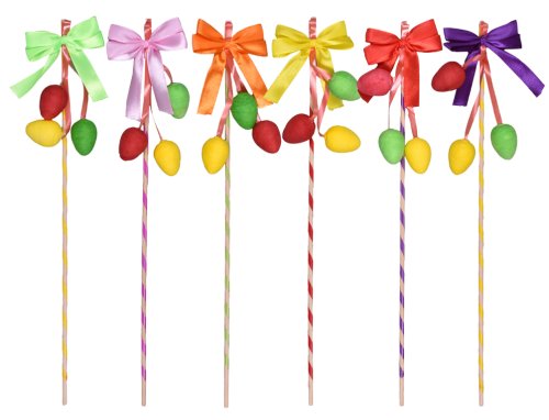 Malá velikonoční pomlázka určená k zapíchnutí do květináče jako velikonoční dekorace. Pomlázka má na sobě barevné stuhy, na kterých jsou připevněna velikonoční vajíčka. Používá se v období velikonoc, jako součást velikonoční výzdoby. Délka 15 cm. Balení: 10 ks.