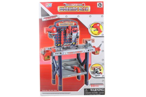 Velký plastový ponk s nářadím. Balení obsahuje ponk o velikosti cca 69 x 26,5 x 75 cm, vrtačku na baterie, svěrák, kleště, pilu, kladivo, klíče a další příslušenství. Napájení vrtačky na 2 AA baterie (nejsou součástíú. Rozměry balení cca 36,5 x 53 x 13 cm. Věk 3+