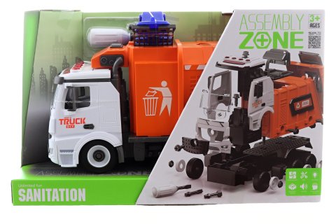 Rozkládací šroubovací popelářské auto na baterie. Napájení na 3xAG13 baterie - jsou součástí balení. Auto má 4 tlačítka s různými zvuky - startování, troubení, couvání, houkání. Balení obsahuje šroubovák. Auto je na setrvačník. Rozměry auta cca 30x16x12 cm. Rozměry balení 35x22x13 cm. Věk 3+