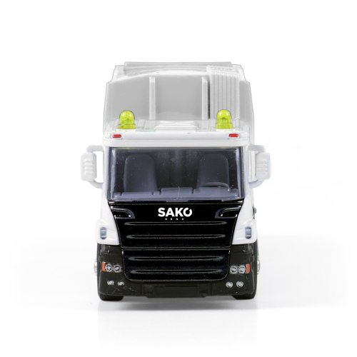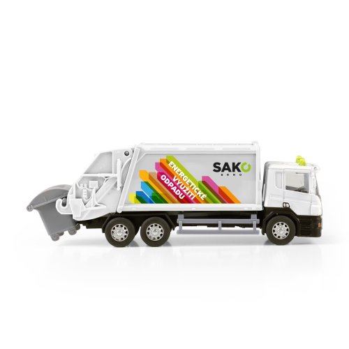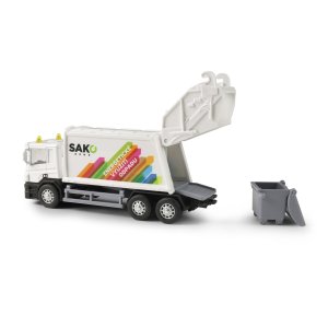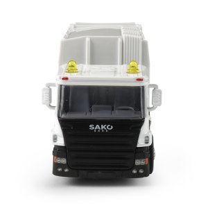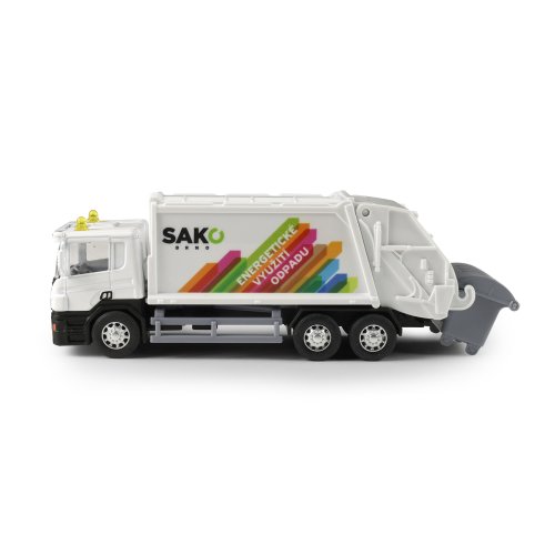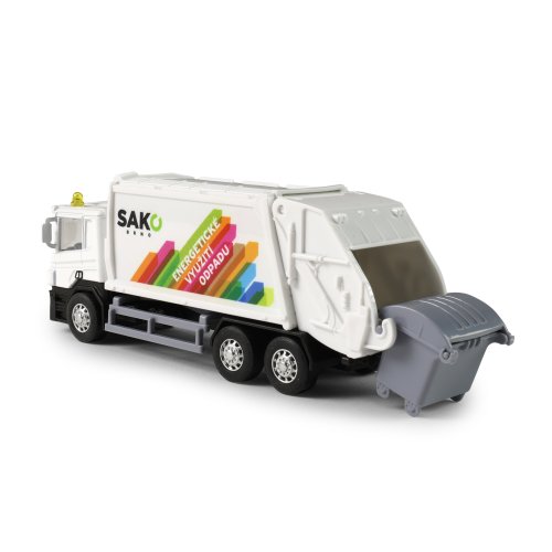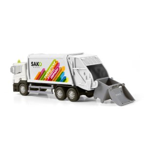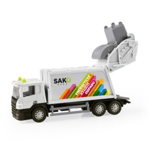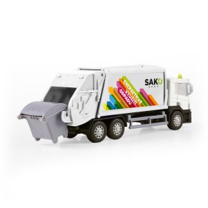 Kovové popelářské auto s plastovou korbou a logem SAKO. Firma SAKO poskytuje komplexní služby v oblasti odpadového hospodářství pro město Brno. Korba má v zadní části odklápěcí dveře, součástí je otevírací popelnice. Auto jezdí na zpětný chod a jeho délka je 15 cm.
