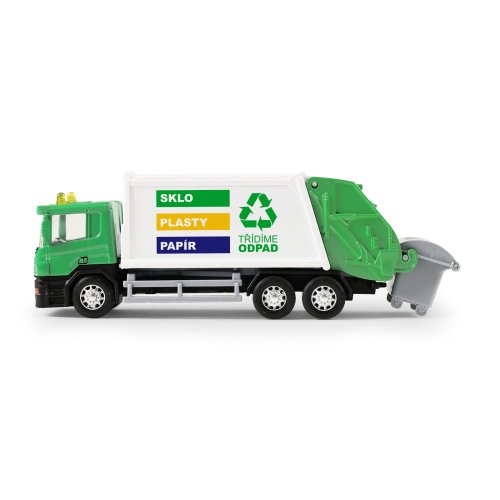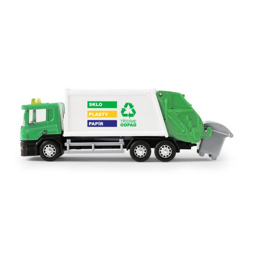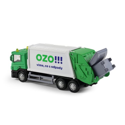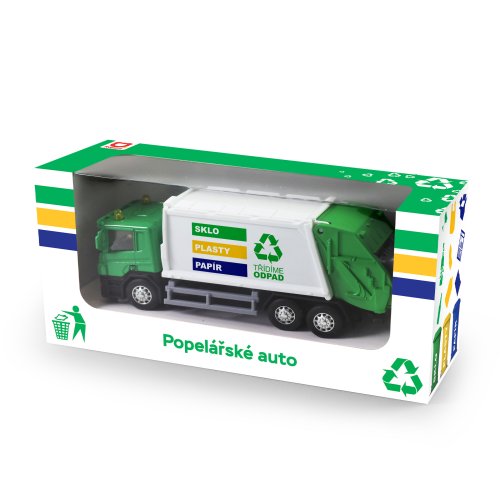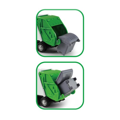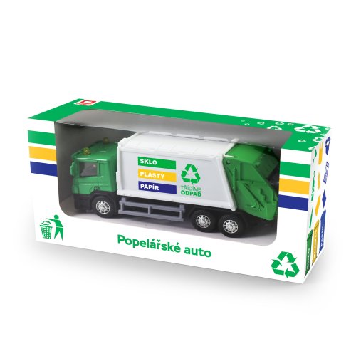 Kovové popelářské auto s plastovou korbou. Korba má v zadní části odklápěcí dveře, součástí je otevírací kontejner. Auto jezdí na zpětný chod a jeho délka je 15 cm.