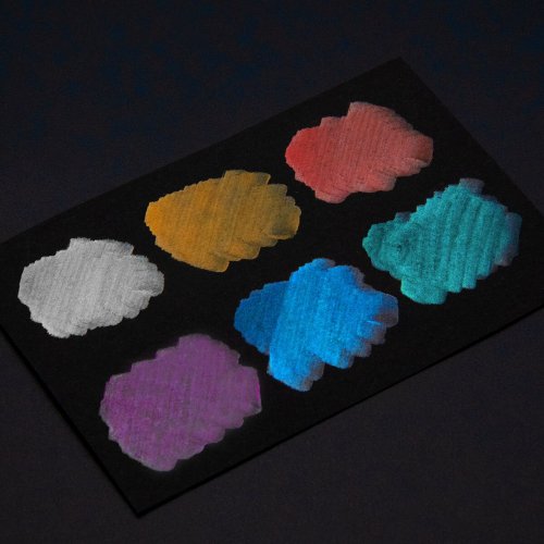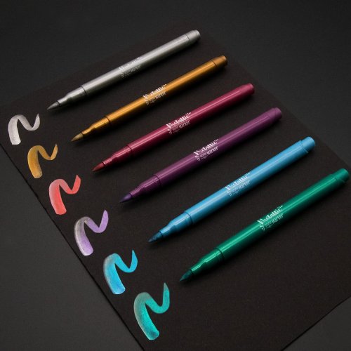 • metalické barvy vyniknou na tmavém papíře, * štětcový hrot, * jasný pigment, * snadné vedení