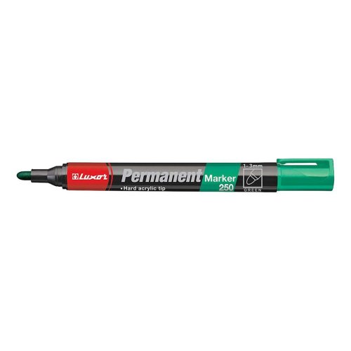 Permanentní popisovač LUXOR 250 zelený s kulatým hrotem lze použít na většinu povrchů.