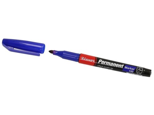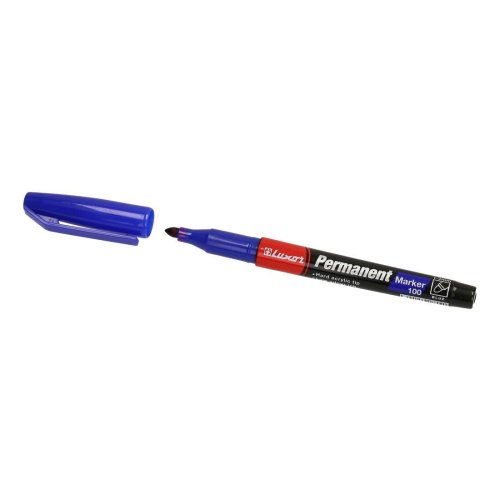 Permanentní popisovač LUXOR 100 modrý s kulatým hrotem lze použít na většinu povrchů.