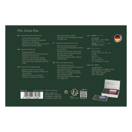 9x hrot B, 2x hrot FM, 1x hrot S, * pH neutrální inkoust bez obsahu kyselin, * inkoust je odolný proti působení slunečního záření, * po zaschnutí voděodolný, nerozmazávající se na papíře, * kvalitní štětečkový hrot zaručuje maximální pružnost a spolehlivý průtok inkoustu, * pigmenty nejvyšší jakosti, * plechové pouzdro