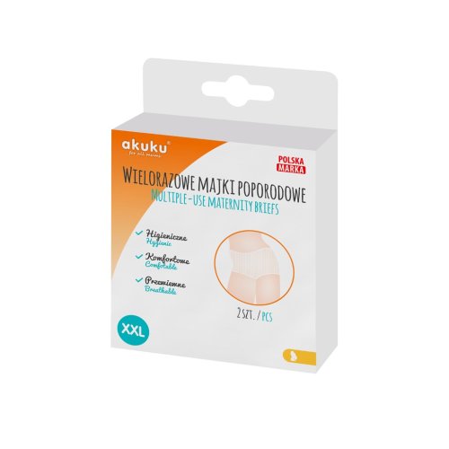 Siťované poporodní kalhotky jsou určené k opakovanému použití, barva bílá, hygienické. Jsou určené k praní, vel. XXL. Kalhotky umožňují volný oběh vzduchu, jsou vyrobené z prodyšného materiálu (síťoviny), v pase a nohavičkách je jemná guma. Obvod boků cca 125 cm. Balení obsahuje 2 kusy.