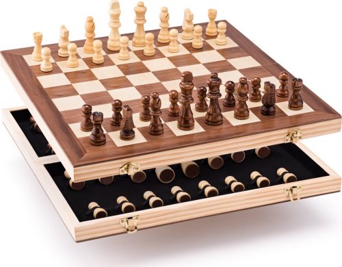 Šachy jsou jedna z nejoblíbenějších klasických stolních her na světě. Získaly si mnoho příznivců různého věku ze všech koutů světa a právem jsou označovány jako "královská hra". Hra obsahuje: dřevěné šachové figurky, dřevěnou polstrovanou otevírací šachovnici s gumičkami pro upevnění figurek. Rozměry: šachovnice 38 x 38 cm, výška krále 7,6 cm, šířka políčka 4,1 x 4,1 cm.