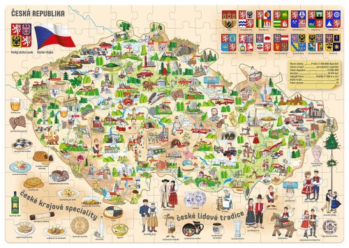 Zeměpisné puzzle pro děti s mapou České republiky a ilustracemi od výtvarníka Josefa Záruby. Na mapě najdete lidové tradice, krajové speciality, vlajku či velký státní znak a další užitečné informace. Veškeré texty na mapě jsou uvedeny v českém jazyce. Skládání barevných dílků rozvíjí u dětí postřeh, zručnost a soustředění. Obrázky představující zvířata, rostliny či budovy navíc stimulují u nejmenších dětí představivost a pomáhají jim poznávat věci charakterizující Česko. Rozměr složeného puzzle cca 67,5 x 47,5 cm