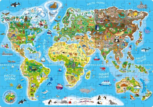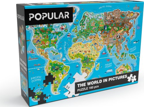 Zeměpisné puzzle pro děti s mapou světa a ilustracemi od výtvarnice Veroniky Budinsky. Na mapě najdete obrázky charakterizující jednotlivé země. Veškeré texty na mapě jsou uvedeny v anglickém jazyce. Skládání barevných dílků rozvíjí u dětí postřeh, zručnost a soustředění. Obrázky představující zvířata, rostliny či budovy navíc stimulují u nejmenších dětí představivost a pomáhají jim poznávat svět. Rozměr složeného puzzle cca 67,5 x 47,5 cm