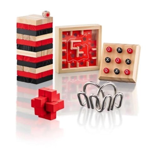 Soubor mini her a hlavolamů v provedení dřevo/kov. Uvnitř najdete nejen miniatury známých společenských her, ale i návody k řešení jednotlivých hlavolamů. Vyzkoušejte však nejprve svůj důvtip, logiku a trpělivost!