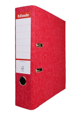 Mramorový papírový pákový pořadač s červenými deskami a hřbetem.