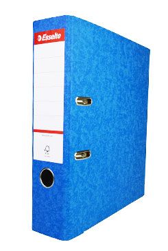 Mramorový papírový pákový pořadač s modrými deskami a hřbetem.