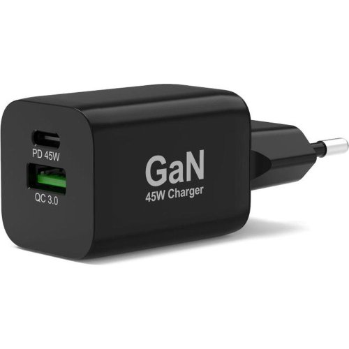 Univerzální adaptér Port Connect GaN síťová nabíječka, 1xUSB-C PD a 1xUSB-A QC, 45W, černá