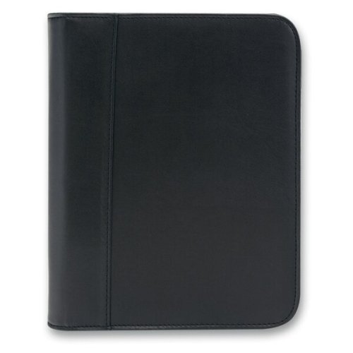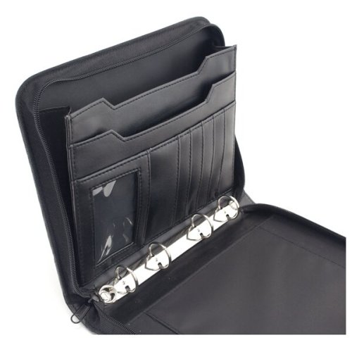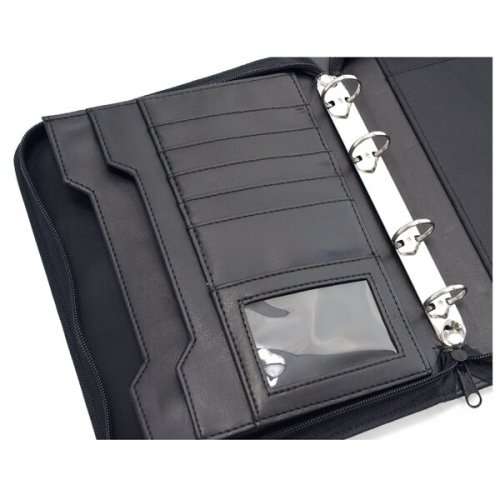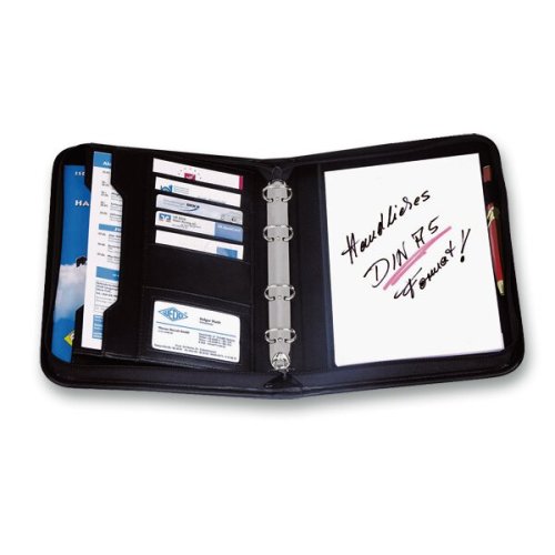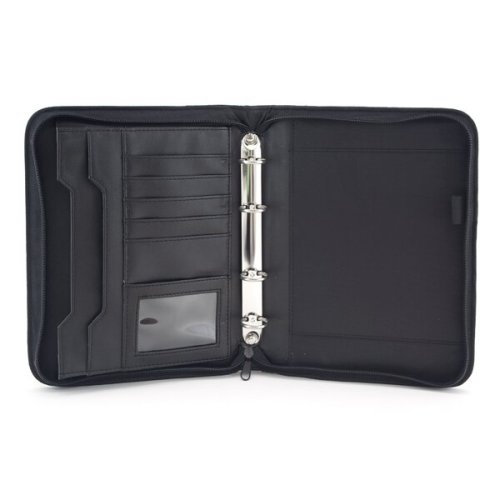 Moderní a zároveň elegantní spisovka vhodná na dokumenty formátu A5. Má 4kroužkovou mechaniku (průměr kroužků 30 mm, výška plnění 20 mm), kapsu na blok velikosti A5, kapsu na dokumenty, 5 kapes na karty a průjlednou kapsu na vizitku, pero je možné uchytit pomocí pružného poutka. Materiál: kombinace imitace kůže a nylonové tkaniny, barva černá Rozměr: 200 x 260 x 45 mm