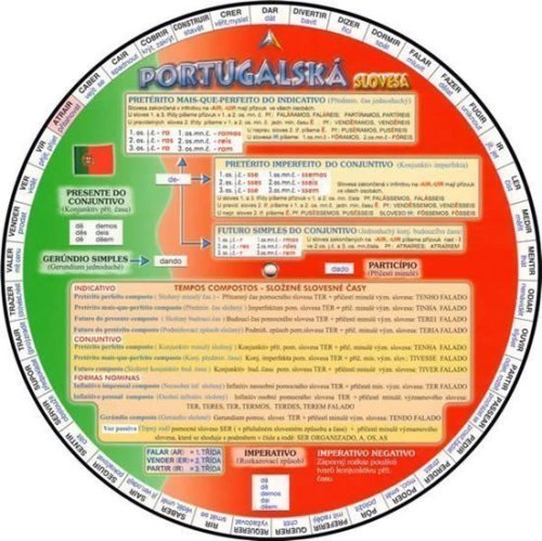 Jedinečné a gramaticky velmi obsáhlé oboustranné kolečko obsahuje celkem 92 nejpoužívanějších portugalských nepravidelných sloves. Pomůcka na obou stranách obsahuje gramatické tabulky s časováním pomocných sloves Haver, Ter, Estar, Ser a tvořením složených slovesných tvarů. Pomůcka je vhodná jak pro začátečníky, tak i pokročilé studenty portugalského jazyka.