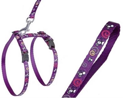 Pohodlný fialový postroj s vodítkem pro koťata z nylonu. Postroj a vodítko jsou vyrobeny z měkkého nylonového materiálu s legračním motivem myší. Díky kompletní nastavitelnosti se nemusíte bát, že by postroj kočku škrtil nebo ji padal. Barva: fialová Rozměry: postroj – 10 mm x 20 - 35 cm vodítko – 1,00 x 120 cm