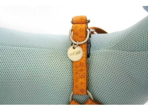 Kožený postroj béžové barvy s celopotiskem, podšitý jemným nylonem ve stejné barvě.