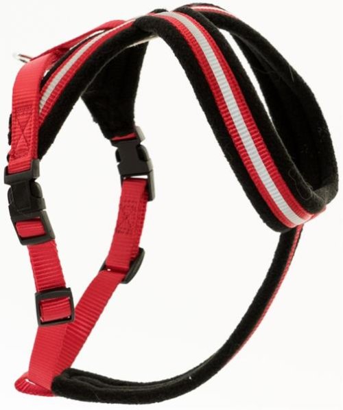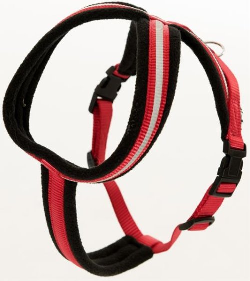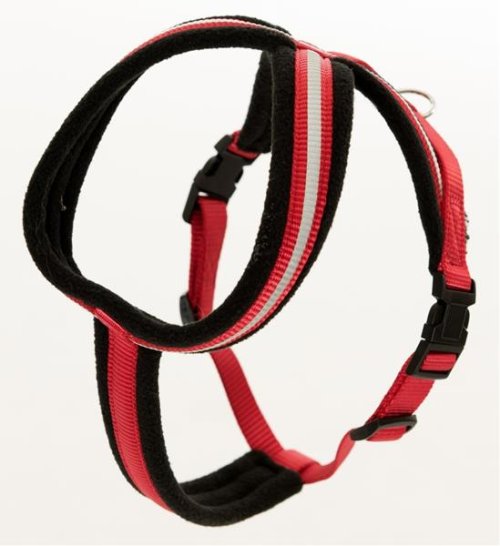 Reflexní nylonový postroj na malého psa v červeno/černé barvě. Postroj je vyroben v kombinaci velmi praktického nylonu a měkké fleecové podšívky, která zajišťuje komfortní a zároveň velmi pohodlné nošení. Nastavitelná velikost postroje kolem hrudníku 42-50 cm. Při zvolení správné velikosti, postroj nijak psa neomezuje v pohybu a neodírá srst. Tato velikost postroje je vhodná pro psa o velikosti, jako je např. papillon nebo čivava. Velmi jednoduché nasazení na psa. Zapínání na plastové přezky. Pro ještě větší bezpečnost psa je postroj opatřen reflexními proužky. Rozměry: 42-50 cm