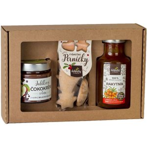 Sada obsahuje: Vánoční perníčky (40 g), jablkový čokokrém z belgické hořké čokolády s kešu (200 g), Rakytník, nápojový koncentrát ze 100% přírodních surovin (250 ml) Rozměr: 25,8 x 17 x 7,4 cm
