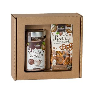 Sada obsahuje: Horká belgická čokoláda, směs pro přípravu horké čokolády (240 g), preclíky s bílou čokoládou a slaným karamelem (70g) Rozměr: 18,4 x 17 x 7,3 cm