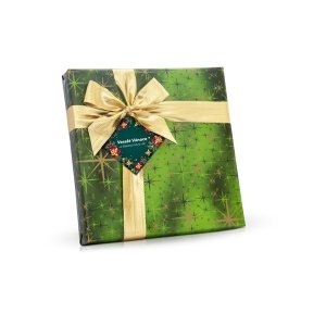 Bonboniéra obsahuje čokoládové plněné pralinky s krémovou náplní v dárkové krabičce s vánočním motivem.