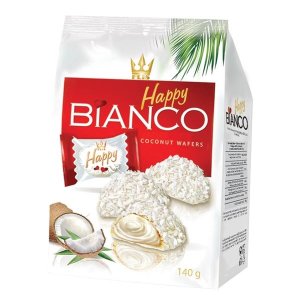 Křupavé oplatky s kokosovou náplní Happy Bianco v bílé polevě sypané kokosem Složení: bílá poleva 35,7% (cukr, částečně hydrogenované rostlinné tuky (řepkový ,palmový), laktóza (z mléka), sušená syrovátka …