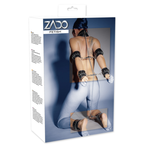 Poutací set se skládá z obojku, pout na zápěstí, předloktí a kotníky.Vše spojeno řetízkem a ozdobeno cvoky. Material je velmi měkká kůže