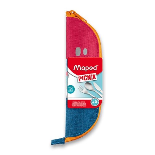 příbor z nerezové oceli, * obsahuje lžičku, nůž a vidličku, * textilní pouzdro na zip, vnitřní materiál hliníková fólie, * příbory možno mýt v myčce, * pouzdro lze snadno očistit mycí houbičkou