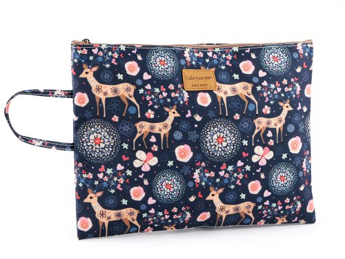 Velké pouzdro z nepromokavého materiálu je velice kvalitní a atraktivní. Má krásně zpracované detaily jako je semišový štítek hand made na přední straně a kovový přívěsek medvídka na zipu. Pouzdro je ploché, hodí se na skicáky, bloky, sešity, školní potřeby, výkresy, dá se do něj uložit laptop a tablet. Přesně se do něj vejde velikost formátu A4 - 210 x 297 mm. Uvnitř má pouzdro podšívku, která má rovněž poutavý potisk. Zapíná se na zip, jeho součástí je poutko na pověšení.