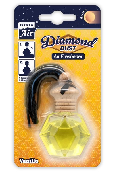 Osvěžovač POWER AIR Diamond Dust 9 ml je kapalinový osvěžovač vzduchu k zavěšení do volného prostoru. Osvěžovač je ve skleničce ve tvaru diamantu, má dřevěné víčko.