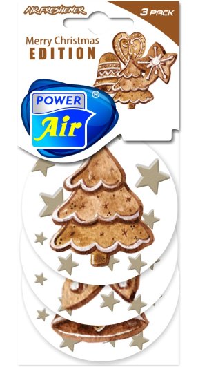 Tři papírové osvěžovače vzduchu POWER AIR Merry Christmas v jednom balení. Osvěžovače na gumičce k zavěšení do volného prostoru s motivem vánočních perníčků.