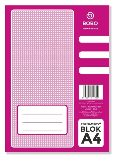 Skvělý pomocník pro každodenní život. Do práce, do školy i na doma. br brLepený poznámkový blok s linkovanými listy z bezdřevého papíru je vhodný do školy i kanceláře, především na rychlé poznámky. Díky lepené vazbě se listy z bloku snadno odtrhávají. br brBlok A4 br• Formát: A4 br• Lineatura: linkovaná br• Linka: 8 mm br• Počet listů: 50 br• Papír: 70g/m2 br• Vazba: lepená, horní