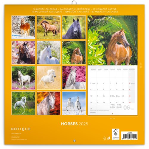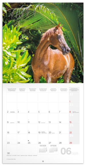 Majestátní krása koní na 12 snímcích známé německé fotografky Christiane Slawik. V kalendáři kromě fotek najdete přehledné kalendárium od září 2024 do prosince 2025 v šesti jazycích, fáze měsíce, důležité svátky a prostor pro poznámky na každý den.
