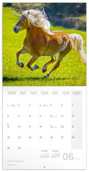 Majestátní krása koní na 12 snímcích známé německé fotografky Christiane Slawik. V kalendáři kromě fotek najdete přehledné kalendárium od září 2025 do prosince 2026 v šesti jazycích, měsíční fáze, důležité svátky a prostor pro poznámky na každý den.