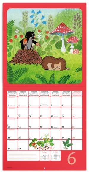 Krteček - postava mnoha kreslených příběhů Zdeňka Milera, které obletěly celý svět. Poznámkový kalendář s ilustracemi z pohádek doplňuje přehledné kalendárium od září 2025 do prosince 2026 v osmi jazycích, měsíční fáze, důležité svátky a prostor pro poznámky na každý den.