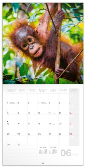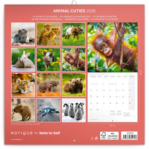 Fotografie roztomilých prasátek, opiček nebo lachtanů vám budou dělat radost celý rok. V kalendáři kromě fotek najdete přehledné kalendárium od září 2025 do prosince 2026 v šesti jazycích, měsíční fáze, důležité svátky a prostor pro poznámky na každý den.