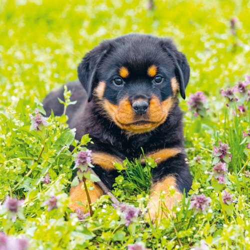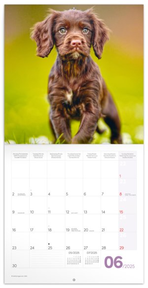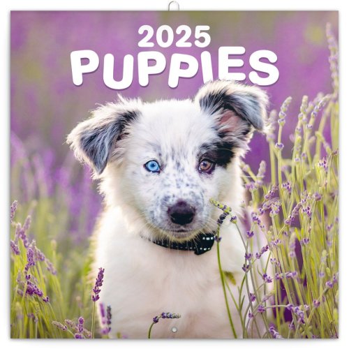 Roztomilá štěňátka na fotografiích v poznámkovém kalendáři. Uvnitř najdete přehledné kalendárium od září 2024 do prosince 2025 v šesti jazycích, fáze měsíce, důležité svátky a prostor pro poznámky na každý den.