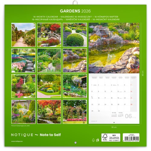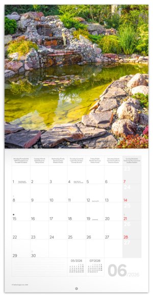 Rozjasněte svůj interiér barevnými fotografiemi šlechtěných zahrad. V kalendáři kromě fotek najdete přehledné kalendárium od září 2025 do prosince 2026 v šesti jazycích, měsíční fáze, důležité svátky a prostor pro poznámky na každý den.