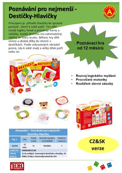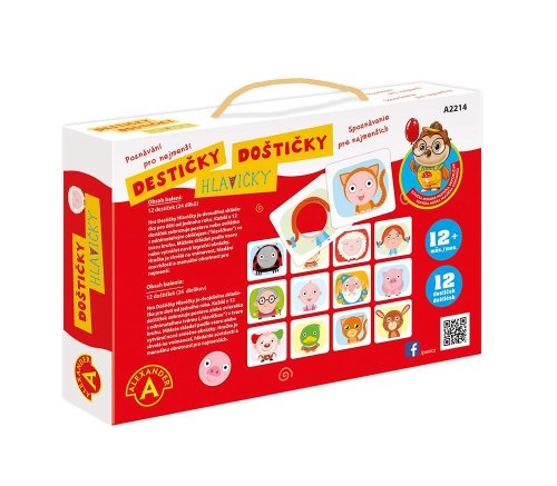 Poznávací jednoduchá naučná skládačka, která rozvíjí základní schopnosti a znalosti batolat od 12. měsíce věku. Rozvíjí logiku, hmat a poznávají barvy a zvířátka nebo postavičky. Hra ze série "Sovička moudrá hlavička". Principem je přiřadit hlavičku ke správné postavě , které k sobě patří. Tím děti rozvíjí logiku, hmat a poznávají barvy a zvířátka. Každá destička má odnímatelný obličej ve tvaru kruhu. Během hry dítě vnímá a vkládá dílky do otvorů v destičkách. Podle zobrazených obrázků pozná, zda k sobě malý a velký dílek patří nebo ne. Pro umístění dílků do otvoru, dítě nejprve prozkoumává jeho tvar a správné natočení. Pokud hlavičky nebudou přiřazeny správně, vzniknout tak legrační obrázky. Hra procvičuje motoriku ručiček a motivuje k lepšímu vnímání a logickému myšlení. Garantem poznávacích her je uznávaná psycholožka z varšavské univerzity Alexandra Petrovská. Hra je vhodná pro děti od 12 měsíců do 3 let. BALENÍ OBSAHUJE: - 12 velkých barevných destiček s obrázky - český a slovenský návod ke hře Obsah balení: 12 velkých barevných destiček s obrázky z pevného kartonu (24 dílků), český a slovenský návod ke hře, pevnou krabici s uchem pro snadné přenášení.