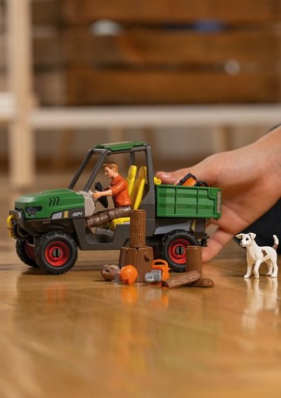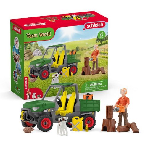 Farmář Paul musí v lese naštípat dříví, než přijde zima. Proto jezdí se svým autem s pohonem všech kol do lesa k pokáceným stromům. Pomocí navijáku vytáhne z hromady těžký kmen stromu. Nasadí si ochrannou přilbu a pomocí motorové pily kmen rozřeže. Jeho Jack Russell teriér ho pozoruje, aby neudělal něco špatně. Když je konečně hotový, žíznivě se napije studené limonády. Hej, kdo to vykukuje z křoví? Ježek přišel od krmelce (prodává se samostatně) a pozoruje ho! Rozměry balení: 22,3 x 27,7 x 10,7cm. Věk: 3+