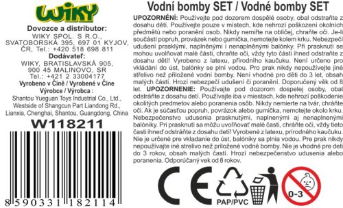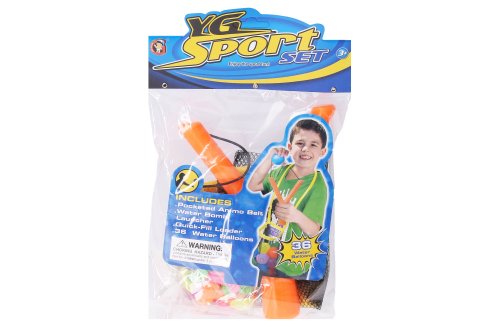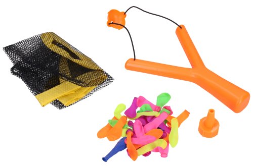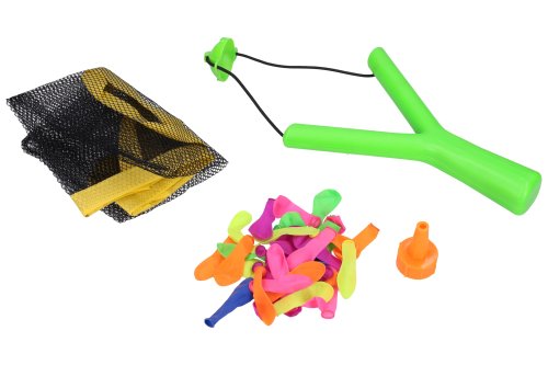 Prak s vodními bombami. Velikost praku 19 cm. Obsahuje prak, 36 balonků, síťovaný pytlík. 2 varianty - zelená, oranžová.