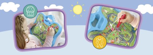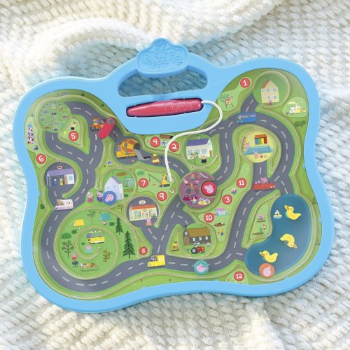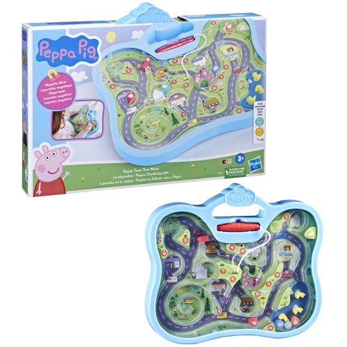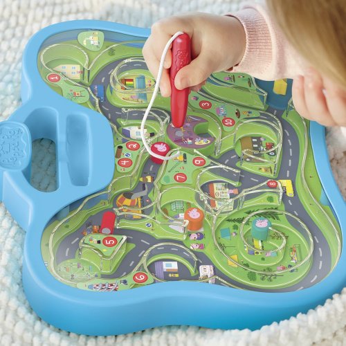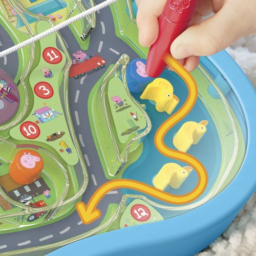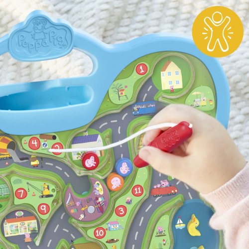 Děti mohou pomocí magnetické tužky (stylus) pohybovat Peppou a její rodinou v bludišti – ale pozor! Některé silnice jsou zablokované! Povzbuďte je, aby si procvičily své jemné motorické dovednosti, když se budou pohybovat po Peppiných oblíbených místech, jako je kemp, trh a zábavní trh. Každé místo je očíslováno, takže si počítání mohou procvičit i děti. Když skončí hraní, stylus lze zasunout do praktického úložného místa. Tato hračka je ideální na cesty. Vhodné pro děti od 3 let.