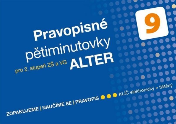 Tento titul, zaměřený na efektivní procvičování pravopisu u žáků 2. stupně ZŠ a VG, vychází z textů učebnice Český jazyk 9 – Učivo o jazyce ALTER a je rozšířen o jevy, které už žáci znají z nižších ročníků. Pravopisná cvičení jsou rozdělena do dvou částí: I. Pravopis lexikální a slovotvorný (psaní i/í, y/ý v kořeni slov; i/í v příponách; velká písmena; písmena na hranici: předpony a kořene, kořene a přípony; n – nn; mě – mně; s-, z-, vz-; u – ú – ů; i/í, y/ý ve slovech cizího původu). II. Pravopis tvaroslovný a syntaktický (koncovky podstatných a přídavných jmen + užití jmen v přívlastku shodném; tvary zájmen a číslovek; osobní koncovky; shoda přísudku se všemi typy podmětu; koncovky v doplňku shodném; interpunkce – čárka ve větě jednoduché: přístavková konstrukce, několikanásobný větný člen, přívlastek, citoslovce, oslovení; interpunkce – čárka v souvětí souřadném i podřadném, věty v různých významových poměrech). Titul je opatřen tištěným klíčem s řešeními.