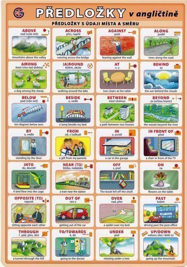 Anglické předložky s českým překladem a ilustrovaným příkladem. Obsahuje předložky s údaji místa a směru, předložky s údaji času a předložkové vazby; ilustrace Adolf Dudek.