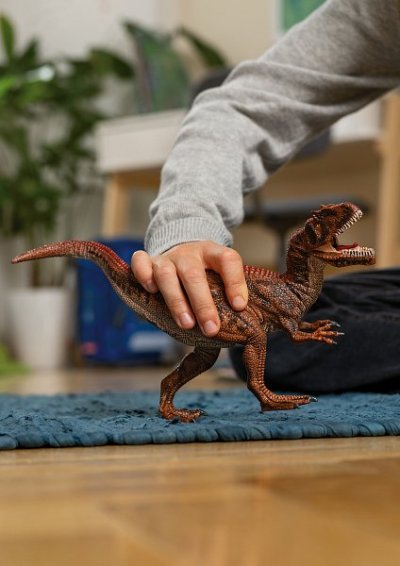 Kdo to přichází zpoza rohu? Díky těžkým krokům už z dálky poznáte, že je to Allosaurus. Vysoký obr kráčí po dvou nohách džunglí a hledá kořist. Přestože je tak velký, je docela dobře maskovaný. Jeho ještěří kůže je totiž vzorovaná tak, že dokonale splývá s okolím. Okolí si prohlíží korálkovýma žlutýma očima. Doufejme, že se najednou nerozhodne, že chce svačinu! Není divu, že tenhle obávaný masožravec patří k nejnebezpečnějším dravcům ve světě dinosaurů. Rozměry figurky: 13,5 x 27 x 7,5 cm. Věk: 4+
